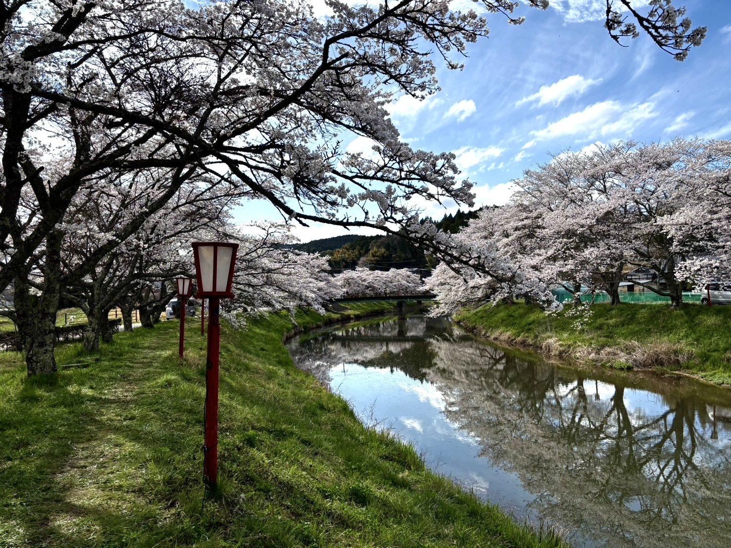 Our route ended up working perfectly, because we simply had to walk further down the riverbank to find the main attraction, Kajiri no Sakura, or “Cherry Trees on the Uda River,” as it’s so aptly named in Google Maps. Here, the cherry trees yawn across either side of the riverbank until the endpoint, Sasagaku Park.